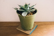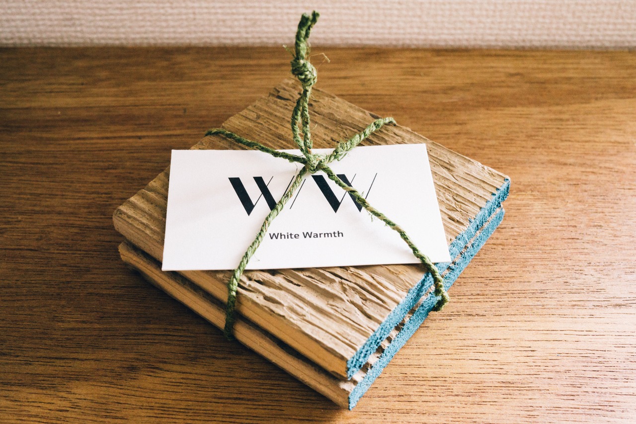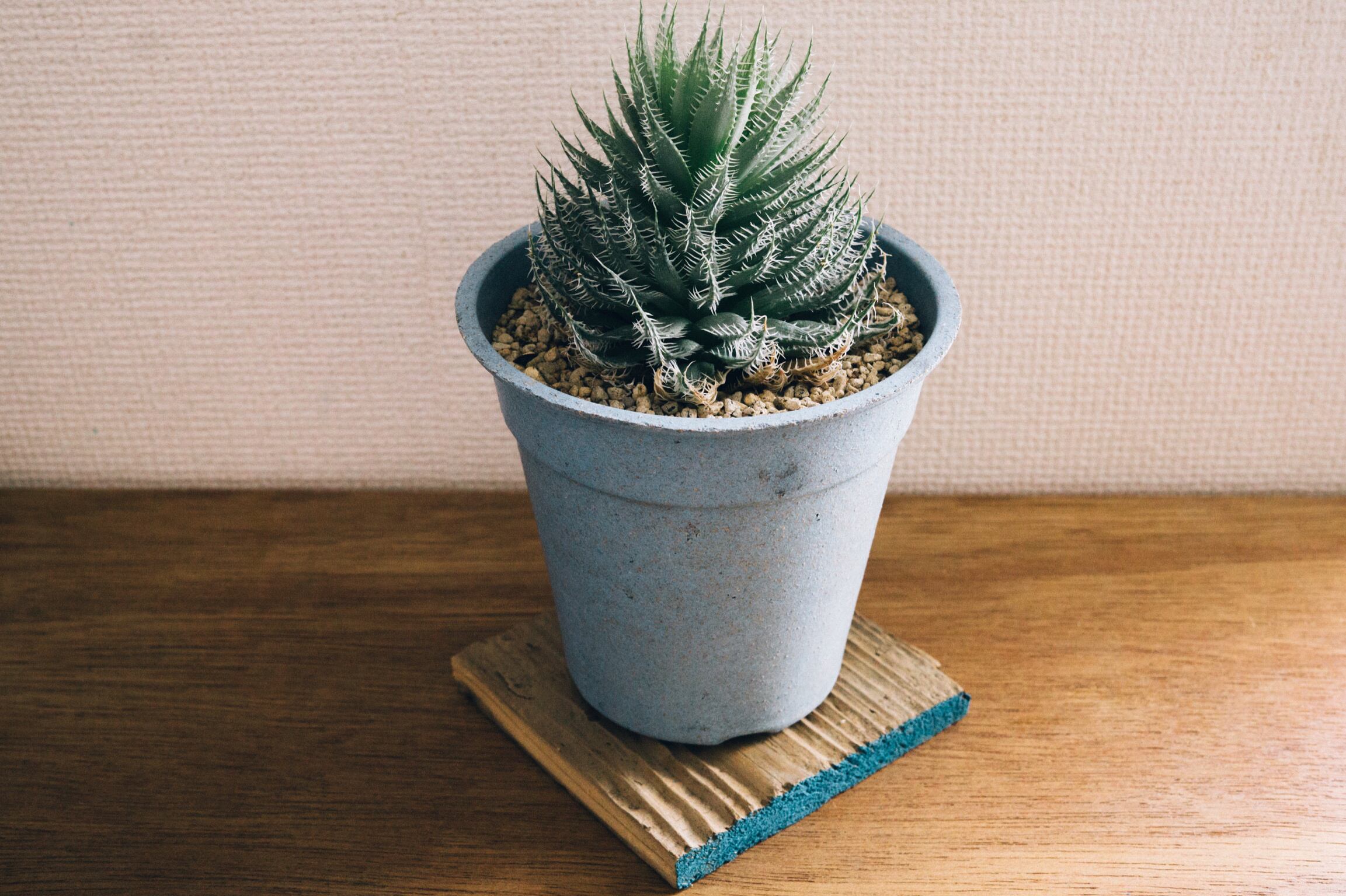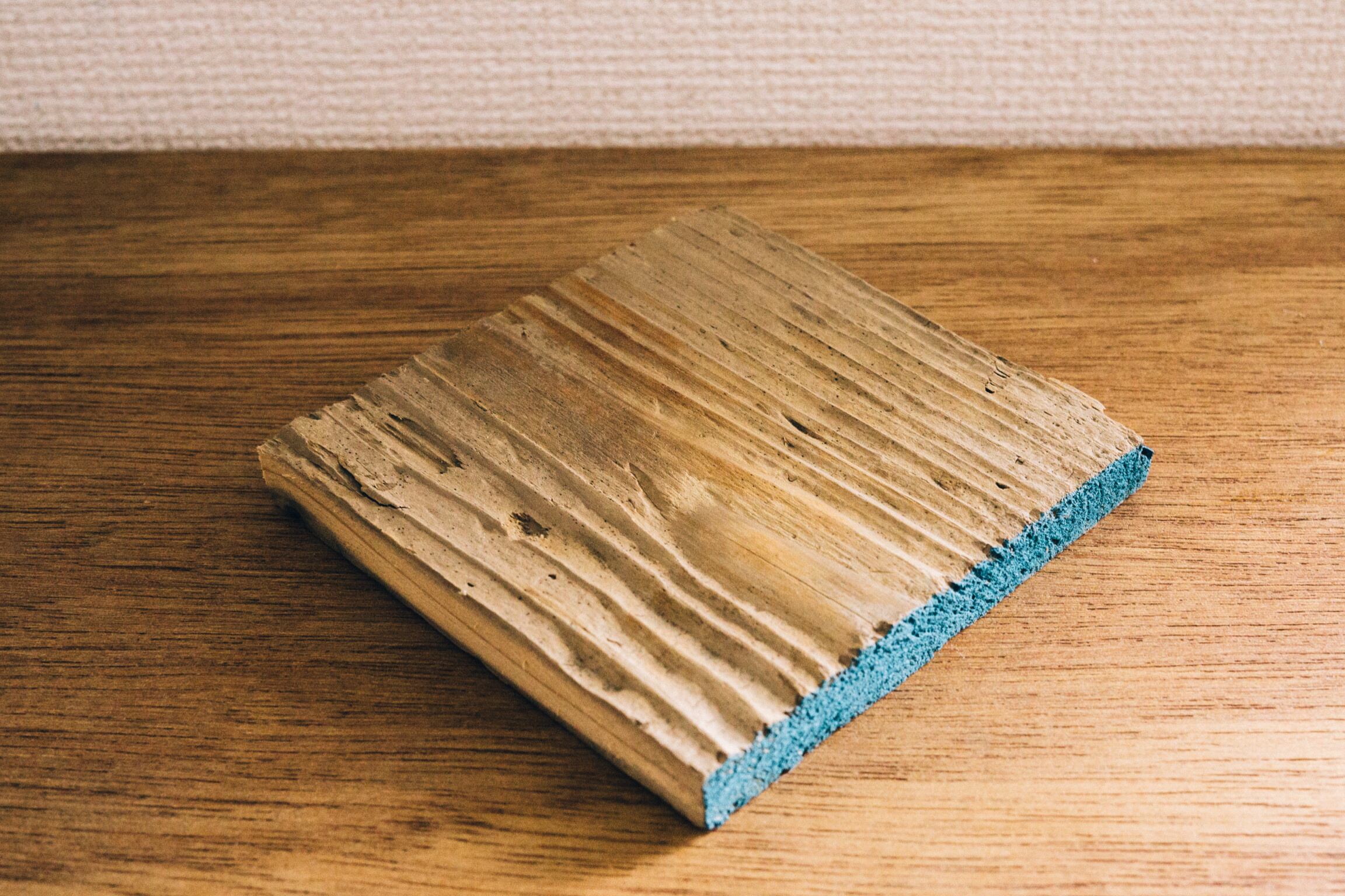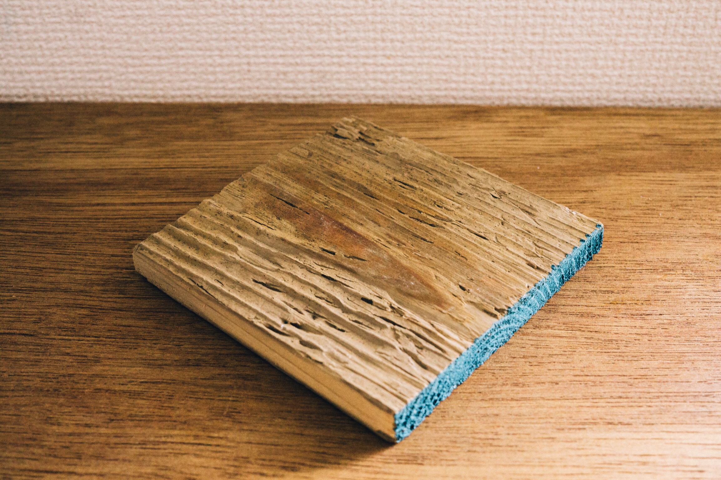 流木をカットして作った2枚組のコースター。断面の一片にだけ、海をイメージしたカラーをペイント。